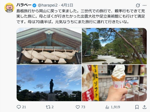 実家から出雲大社や足立美術館まで、親を連れて旅行してきました。