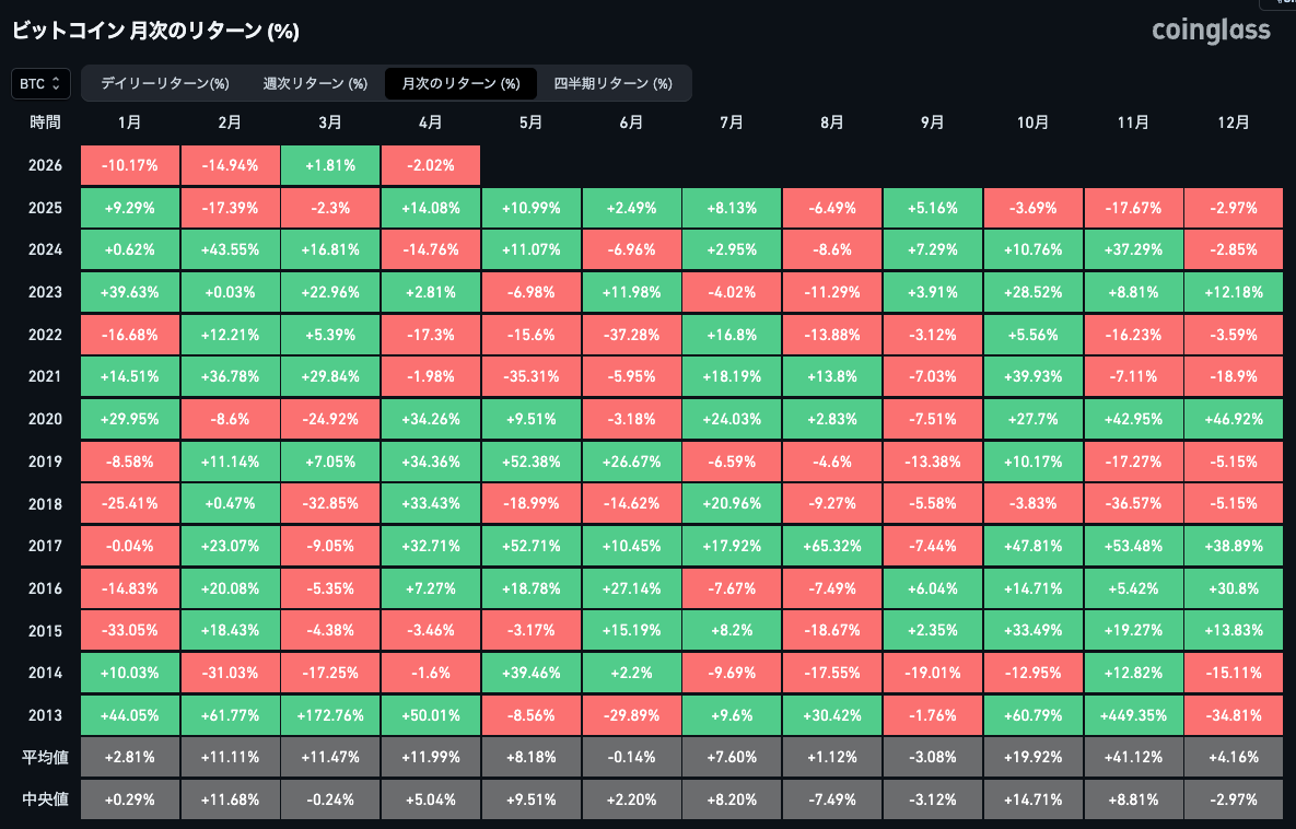 ▼BTCの月次リターン
